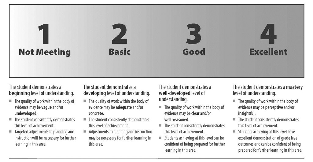 Parents sometimes ask how their particular children “rank” against the other children in the classroom. We would remind parents that in Alberta, we assess student learning based upon the student’s ability to achieve the outcomes and Front Matter from the Programs of Study. The report card indicator scale provides a description of the degree to which each child is achieving those outcomes. The following chart provides a fuller description of what teachers are looking for when measuring achievement: